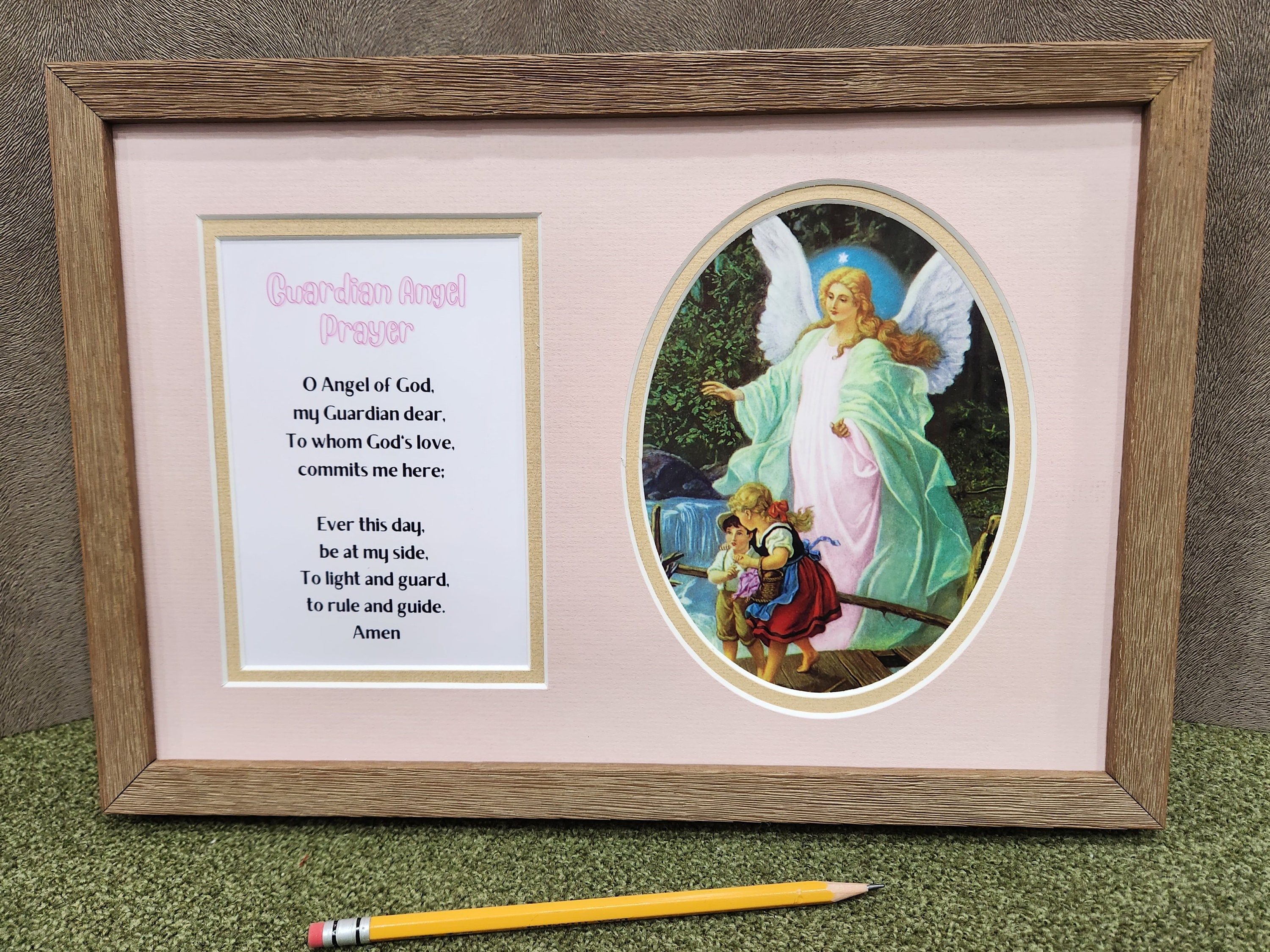 A vintage print of the famous image of a Guardian Angel watching over two small children crossing a bridge. Besides the custom framed picture of the Guardian Angel is the prayer to your Guardian Angel. Two frame colors are available. The matting is pink and tan. Glass and a hook on the back make this cute picture ready to hang. A nice gift idea for a baby or young girl's birthday, baby shower gift, First Holy Communion, or Newborn. This timeless image of the Guardian angel will be a lifelong keepsake. The size of the frame measures approximately 12" X 16" from the outermost edge to the edge of the frame.