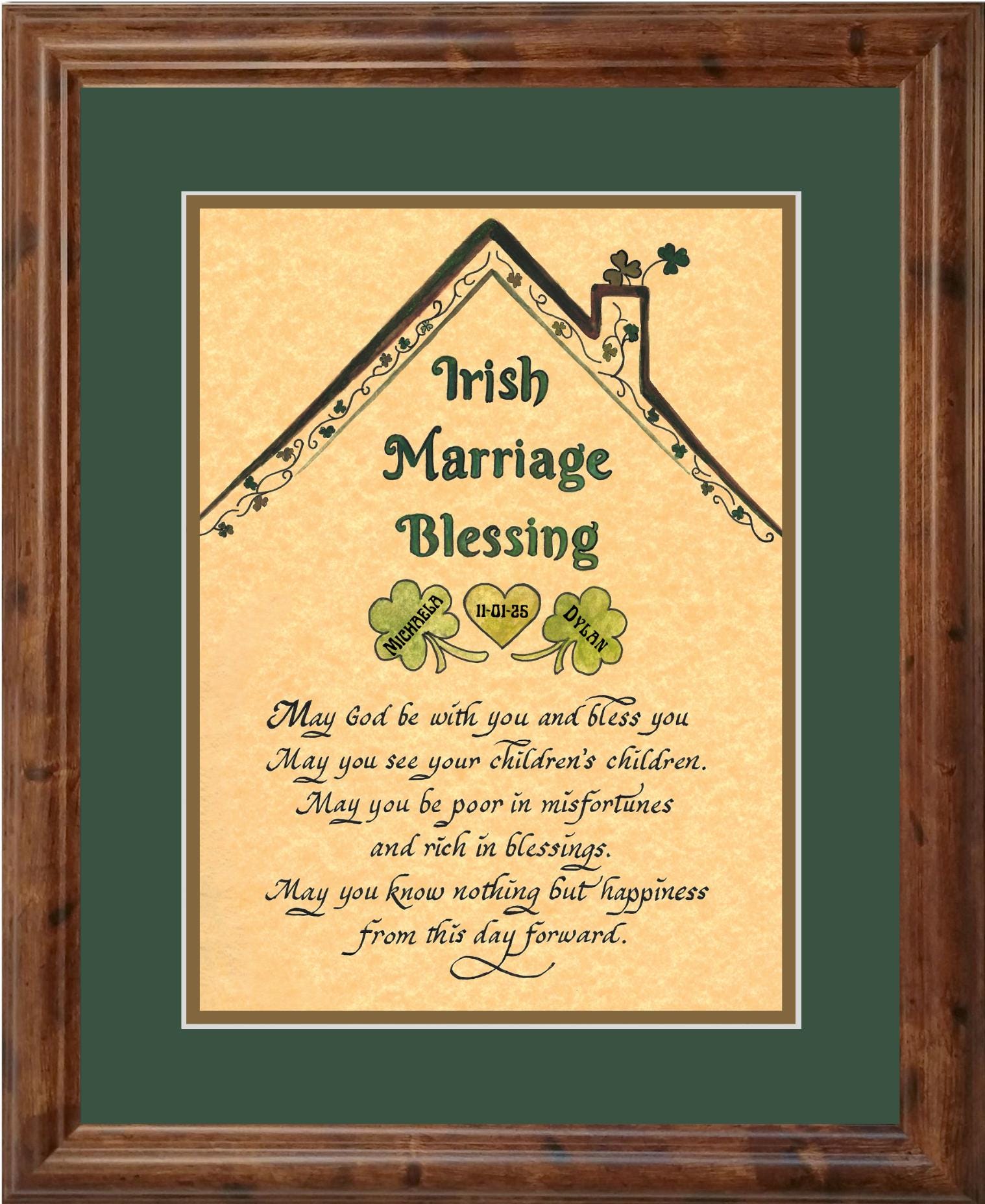An Irish Marriage Blessing poem for the Bride and Groom. This special framed keepsake will bless the happy couple. The first names and numerical dates make this gift a one-of-a-kind display. It is available in two sizes and two frame colors. Complete with glass, hook and dust cover.
