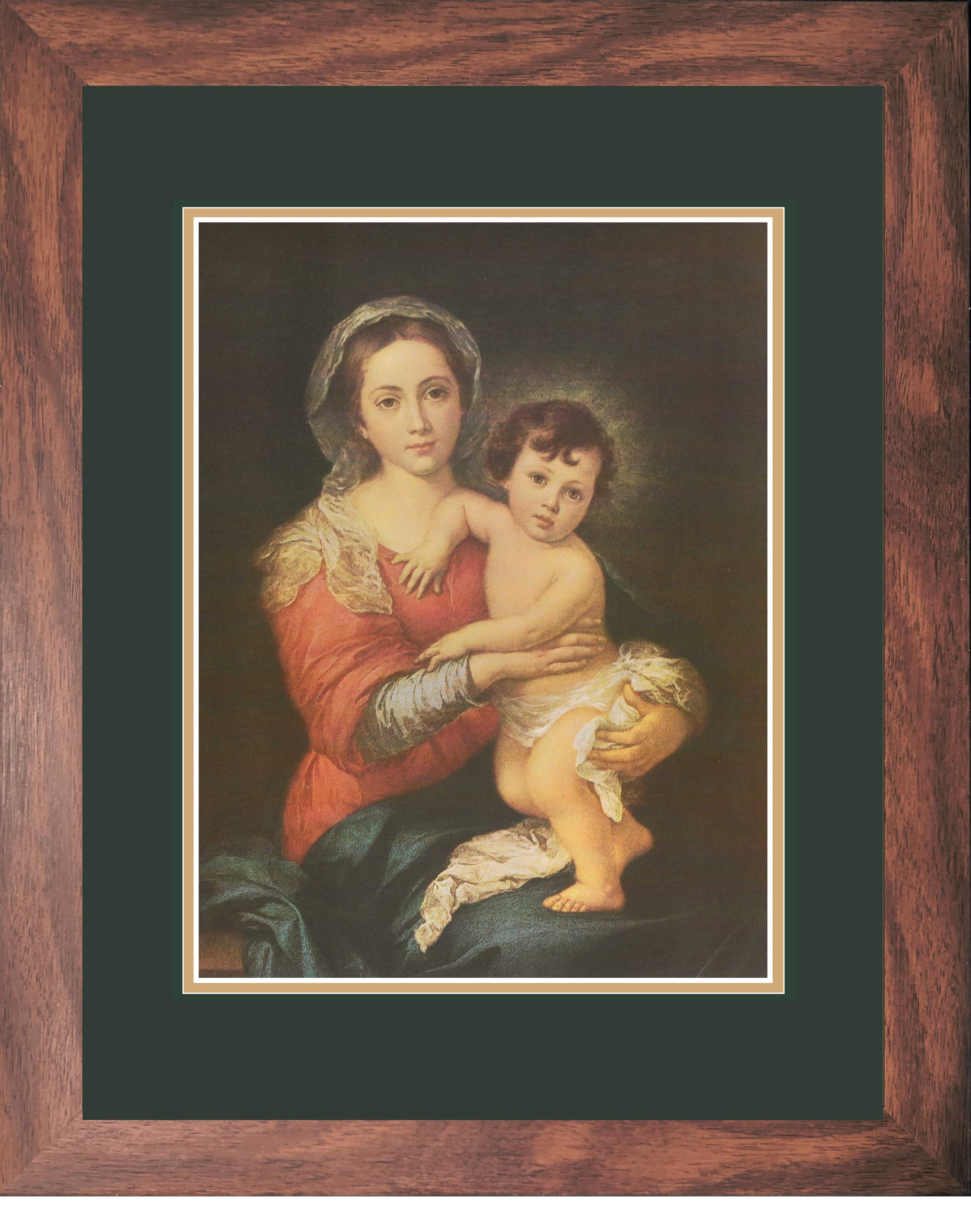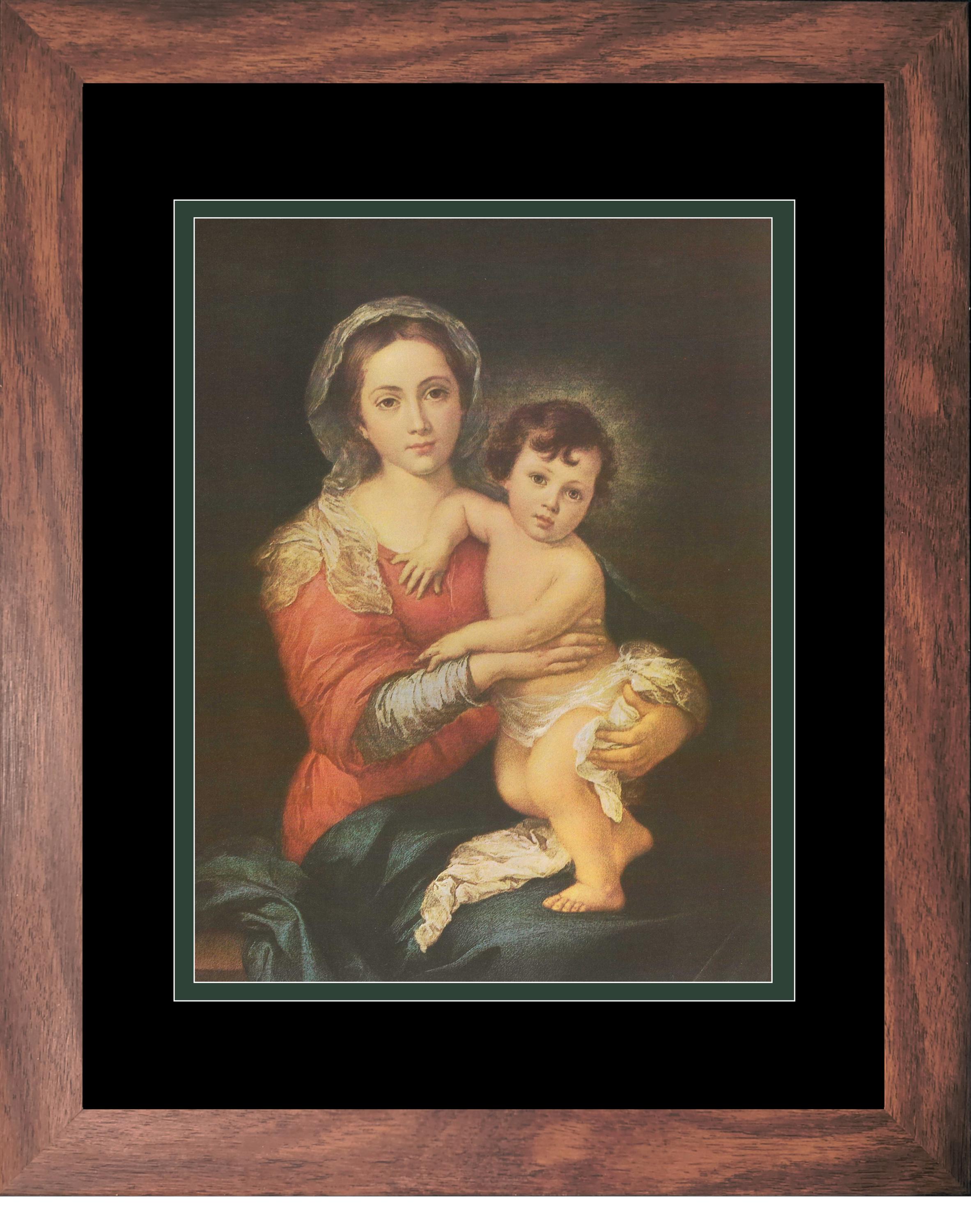 Madonna and Child print framed religious art picture. Size measures 13" X 16" from the outermost edges of the frame. Complete with glass, hook, and dust cover. A treasured picture for your home decor or gift giving.