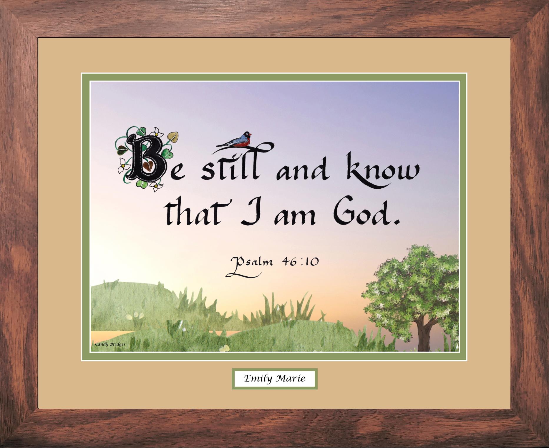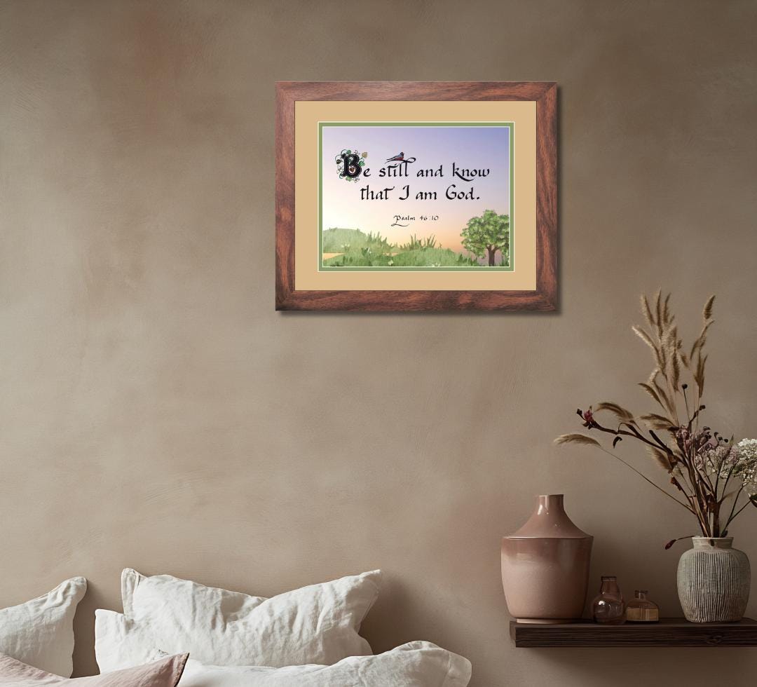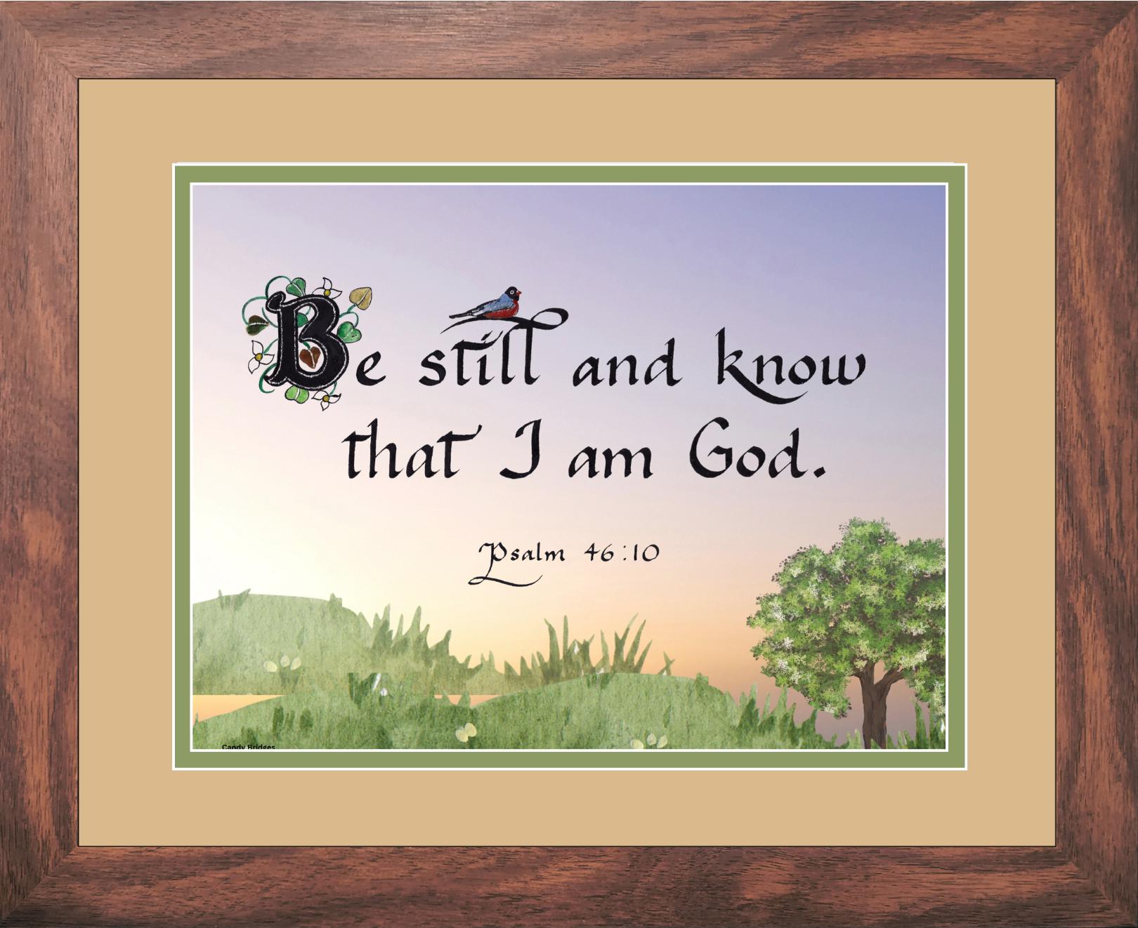 Psalm 46 - Verse 10. Be still and know that I am God, framed Scripture for your home, office, and gift giving. A comforting verse from the Bible that helps keep our minds focused, knowing that God is in control. This framed print showing a resting bird, a decorative first letter, and a green field with a tree will delight the viewer and remind them to be still and let God be in control. Psalm 46:10 comes double matted and is surrounded by a walnut colored frame. Available in an 8" X 10" frame or the bigger 11" X 14" frame. Complete with glass, hook, and dust cover.