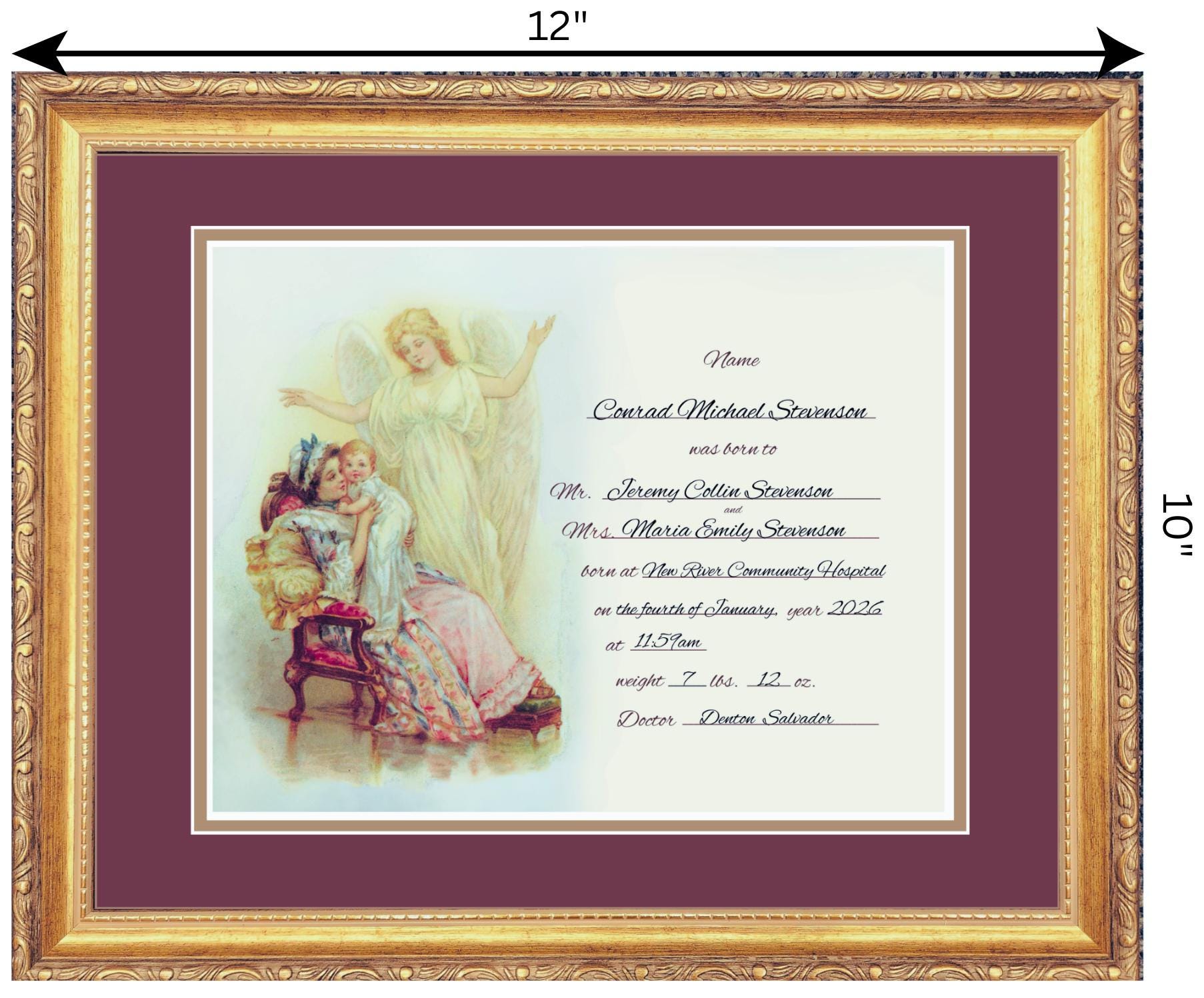 This Victorian replica Birth Certificate is a smaller size, measuring approximately 10' x 12" from the outermost edges of the frame. Tastefully matted and framed in your choice of four colors. It is ready to gift as a gift and hang with a hook or wire on the back. Protected by glass. If you are looking for a larger size, here is the link https://candyschristiangifts.etsy.com/listing/4431529183