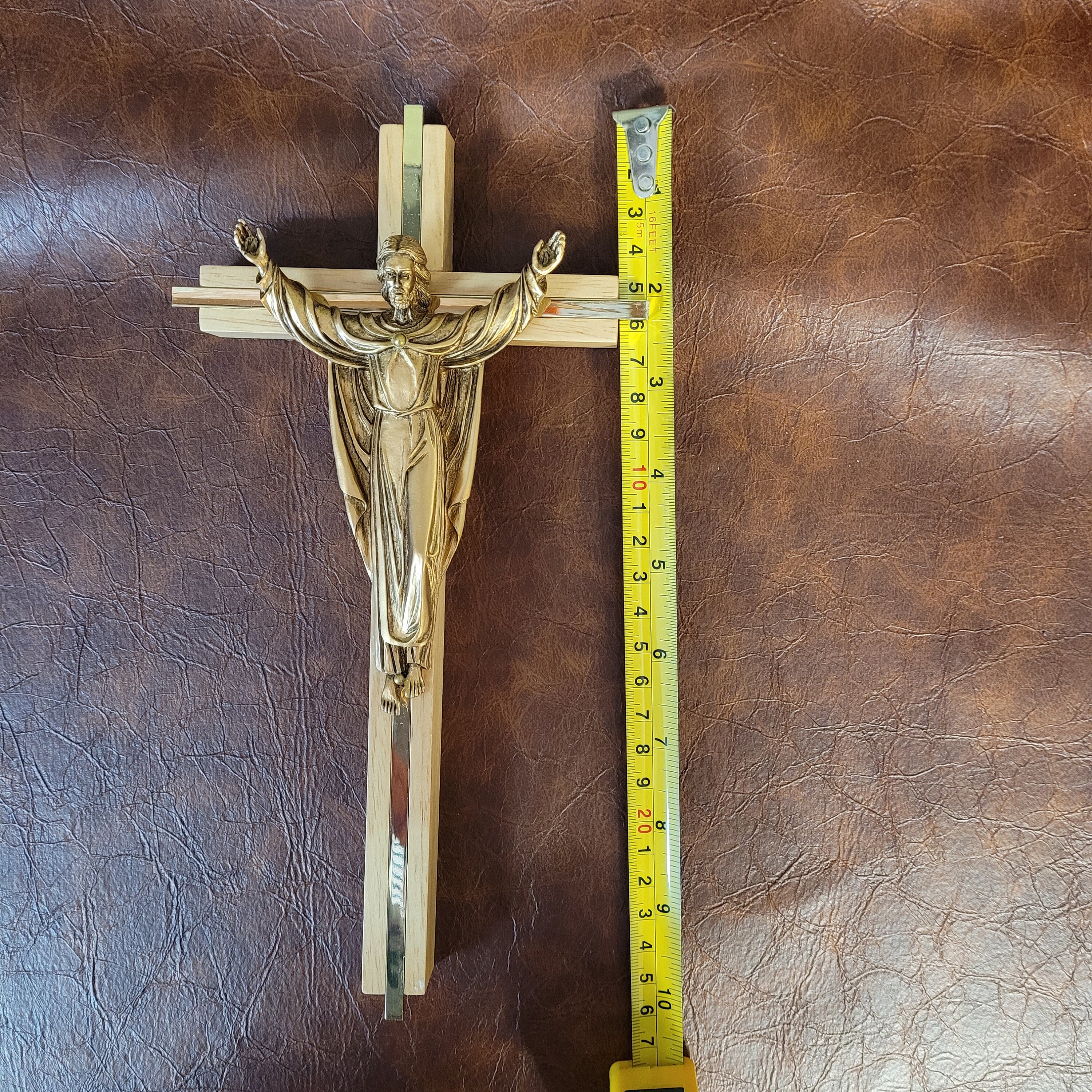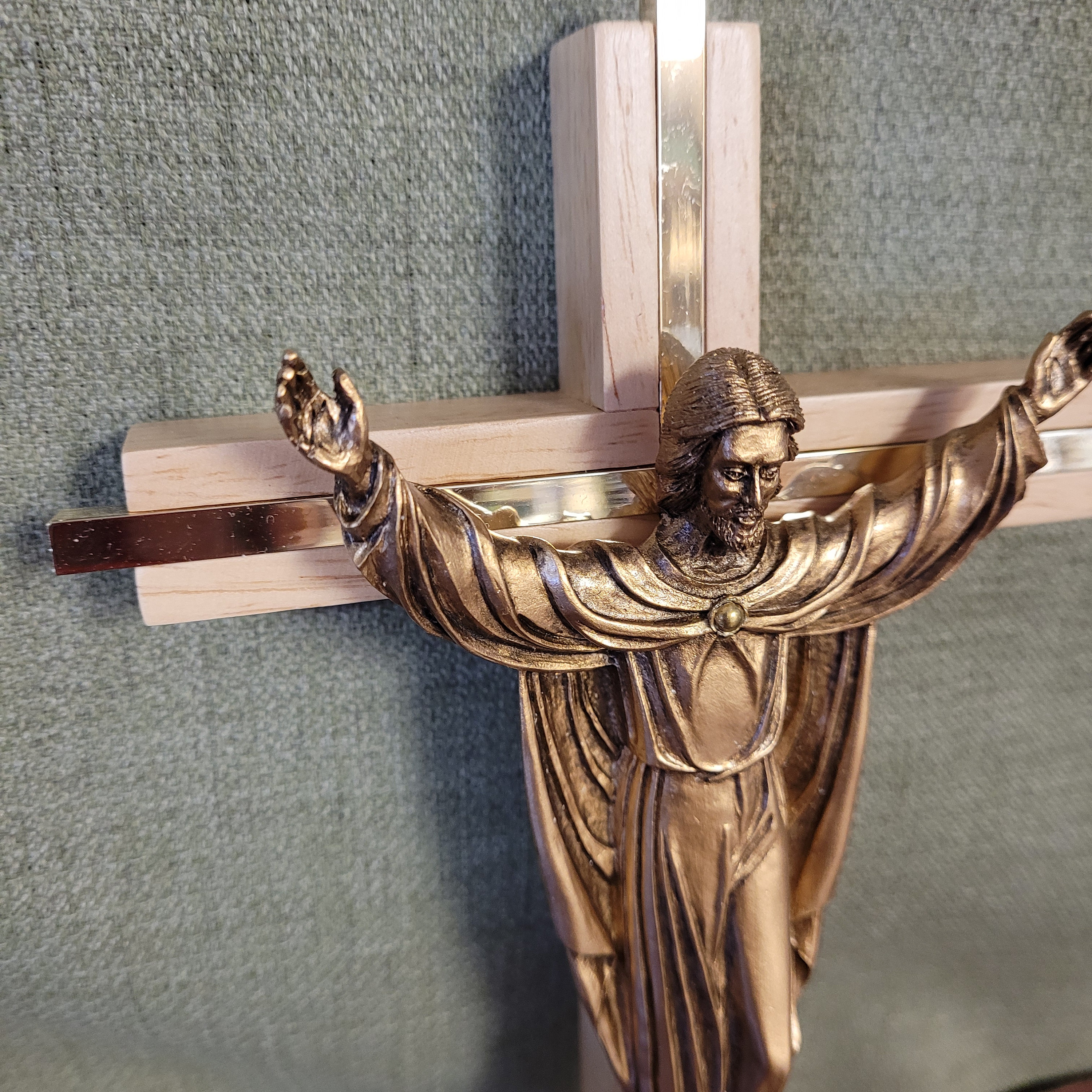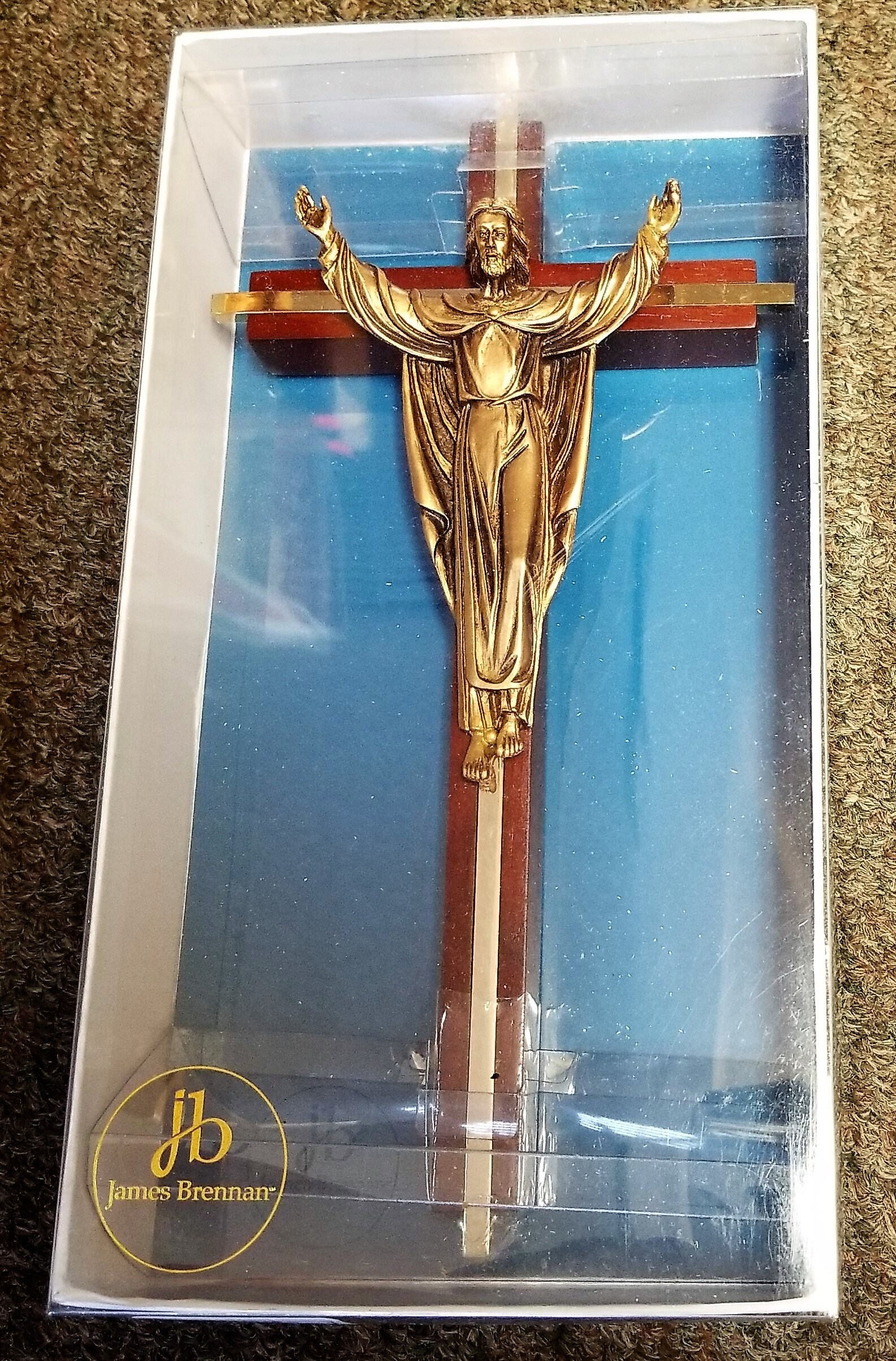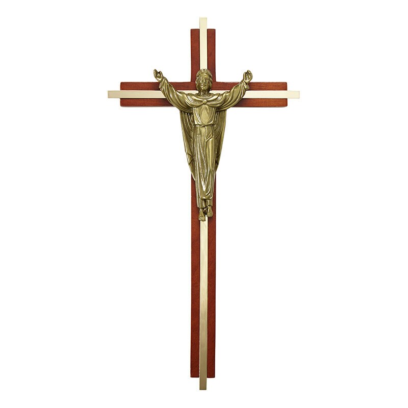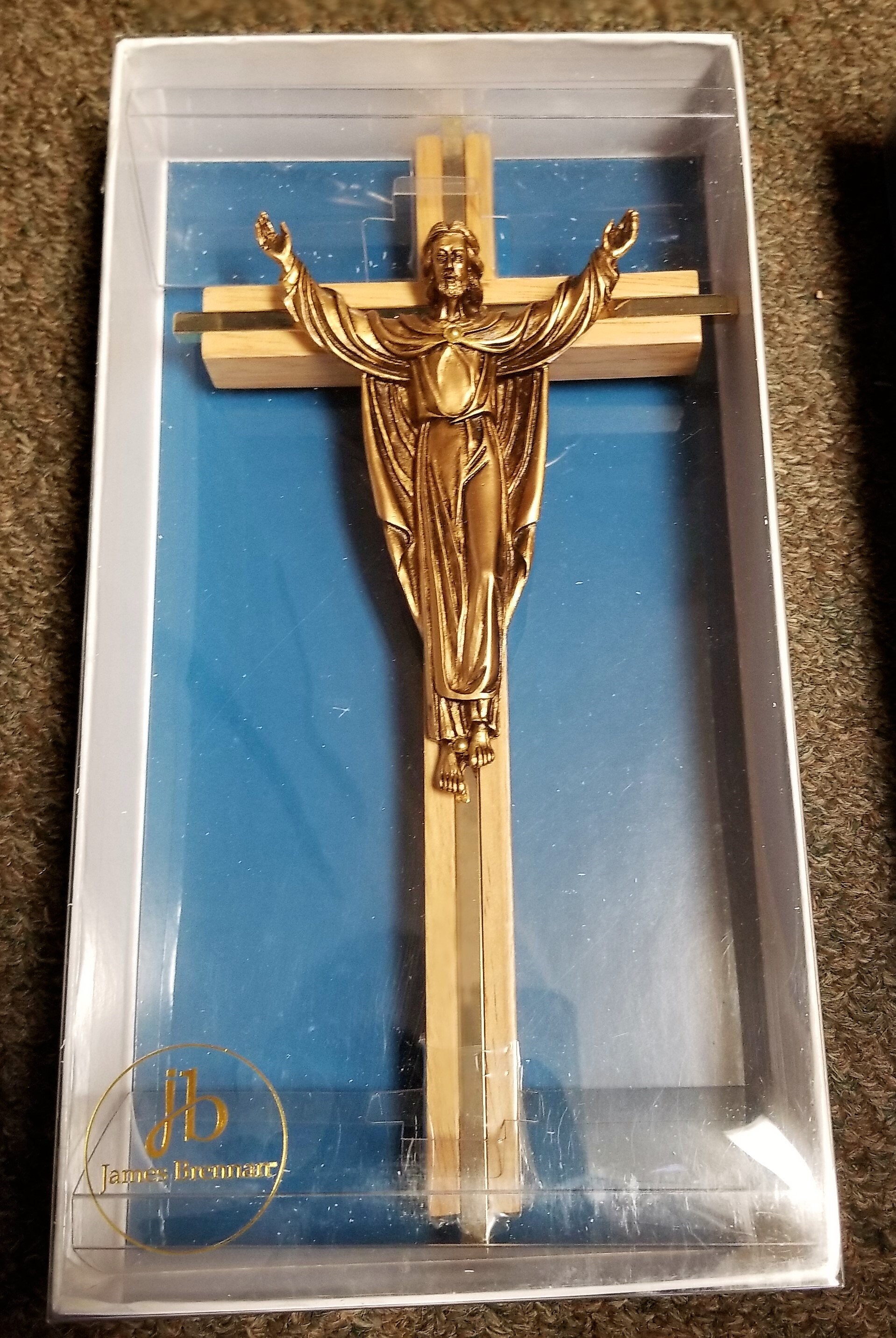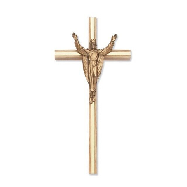 I did not make this beautiful wall cross but have it in my shop to sell. James Brennan Risen Christ wall cross 10" high for home, church, office, and gift-giving. Available in both maple and oak finishes beautiful risen Christ cross. The Risen Christ cross is made of maple hardwood with gold plate inlay and the figure is antiqued to add dimension and depth to the plating and then lacquered for durability with a quality patina finish. Cross comes boxed for easy storage or gift-giving.